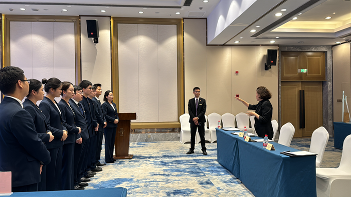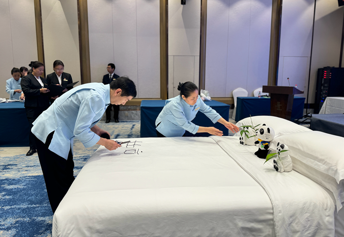 崗位技能競賽同樣精彩紛呈。客房服務(wù)創(chuàng)意大賽中,“生日慶典”“進(jìn)博風(fēng)采”“浪漫邂逅”和“節(jié)日慶典”四套精心設(shè)計(jì)的主題套房,融合獨(dú)特設(shè)計(jì)理念,為賓客帶來全新的住宿體驗(yàn)。評委團(tuán)細(xì)致評審,鼓勵員工發(fā)揮創(chuàng)意,為顧客打造溫馨的居住空間。前廳服務(wù)技能比拼環(huán)節(jié),前廳部門的精英們進(jìn)行了多輪技能展示與服務(wù)情景模擬,從禮儀服務(wù)到英語咨詢問答,無不展現(xiàn)出他們高超的專業(yè)素養(yǎng)與個性化的服務(wù)技巧。