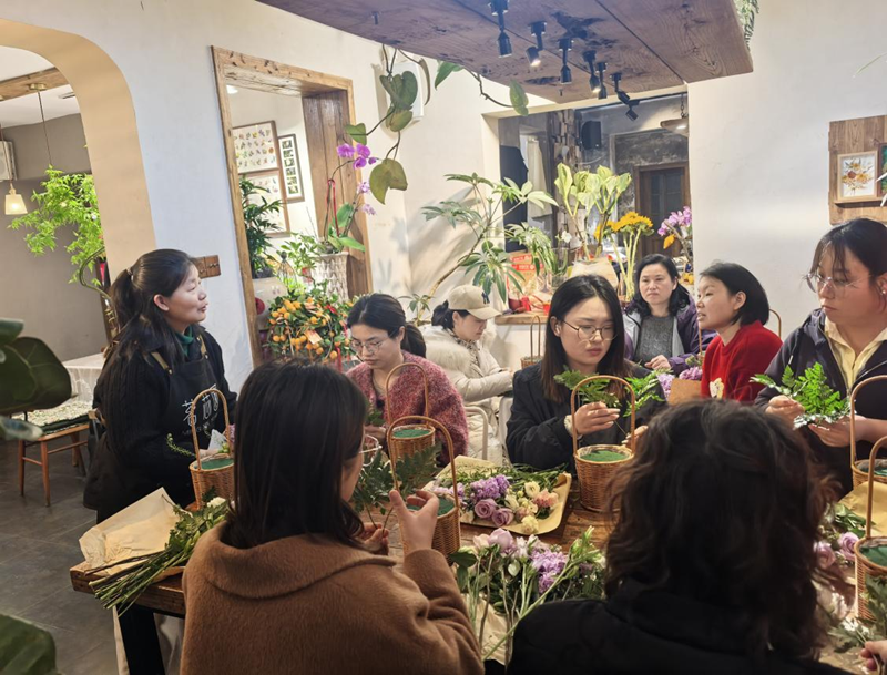 活動現(xiàn)場,專業(yè)花藝老師為大家詳細講解了花藝知識、色彩搭配技巧和插花步驟,并進行了現(xiàn)場示范。在老師的悉心指導下,女職工們興致盎然地投入到創(chuàng)作中。大家手持花材,認真修剪枝葉、精心搭配色彩,將玫瑰、桔梗、各類葉材等普通花材,巧妙地組合進藤編花籃中。從確定主花位置,到搭配輔花、填充葉材,每一個步驟都凝聚著大家的巧思與心意。